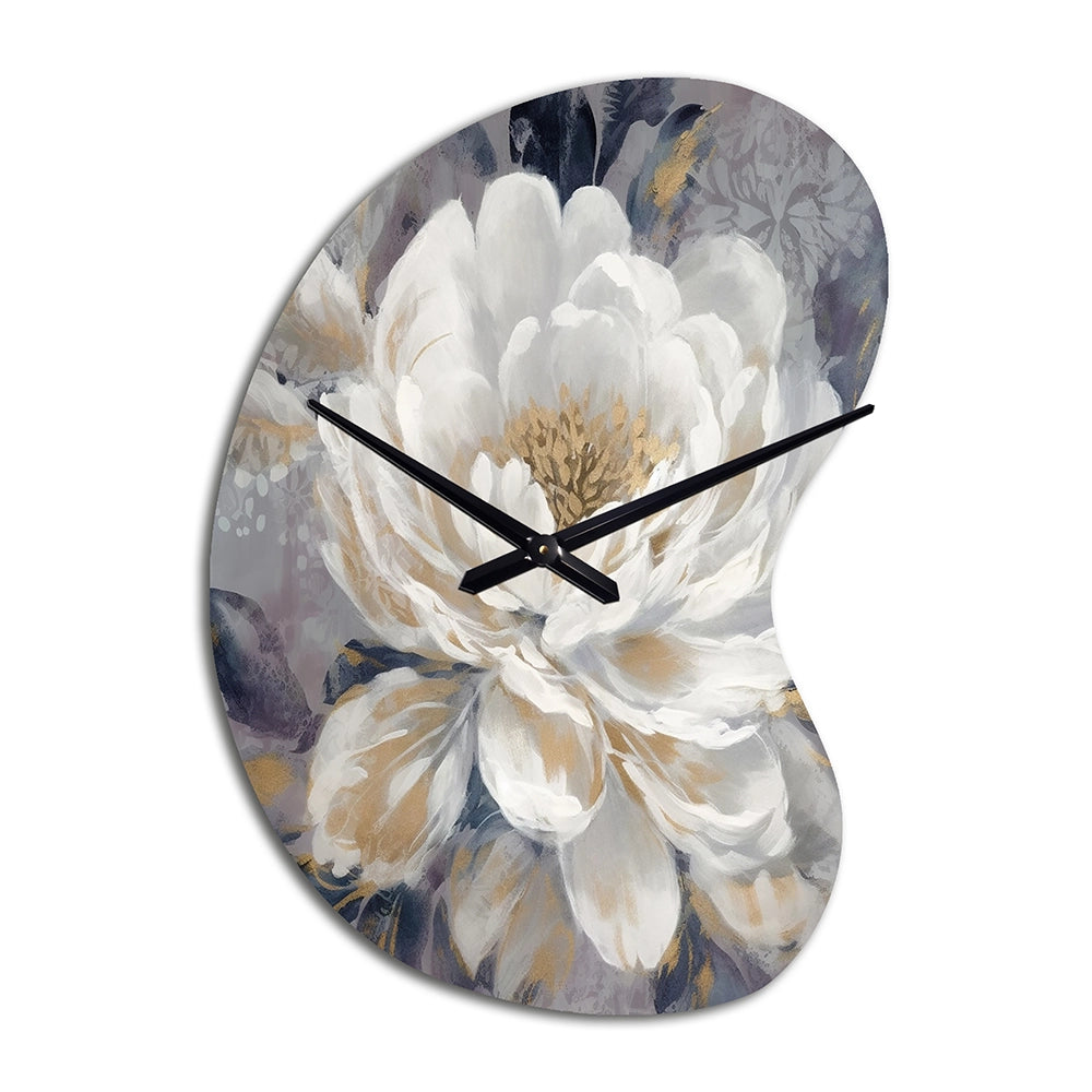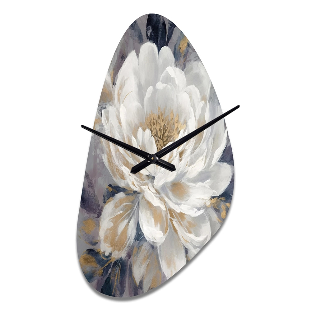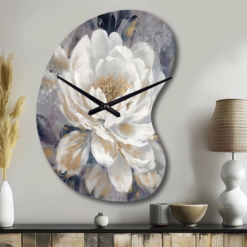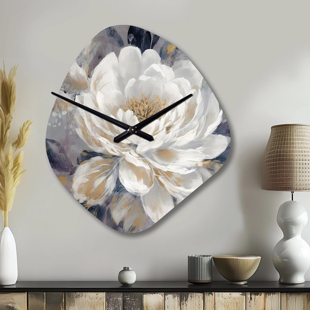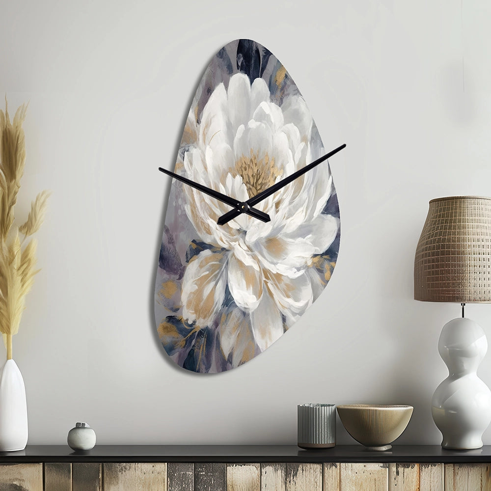 Emotions Of White Gold Peony Flower I - Asymmetric Metal Wall Clock
