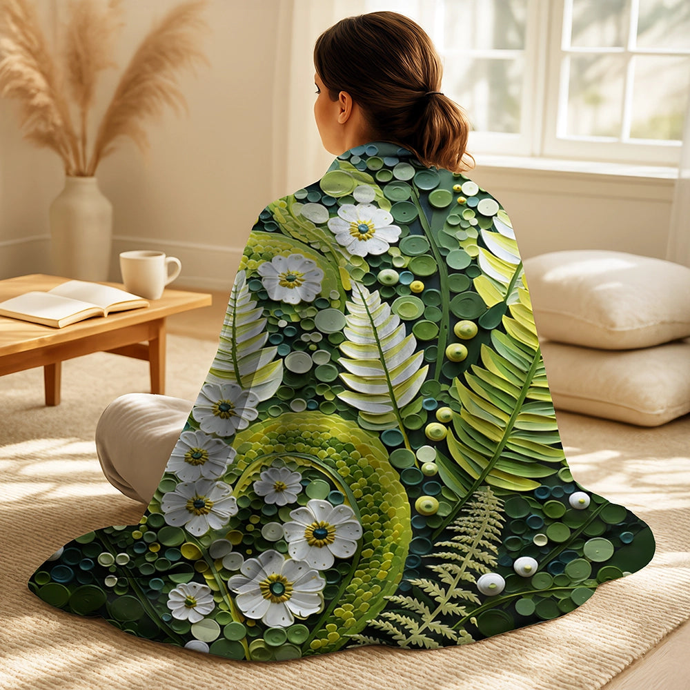 Ferns Throw Blanket Set - Light Green Ferns Plant Whimsical Spirals I