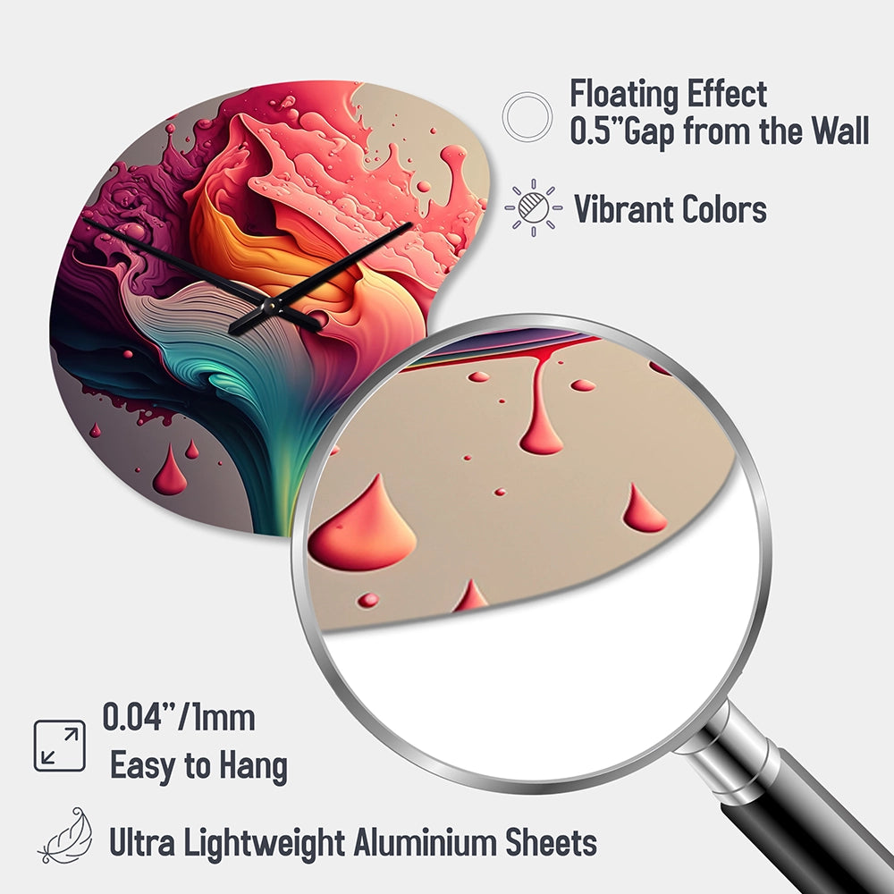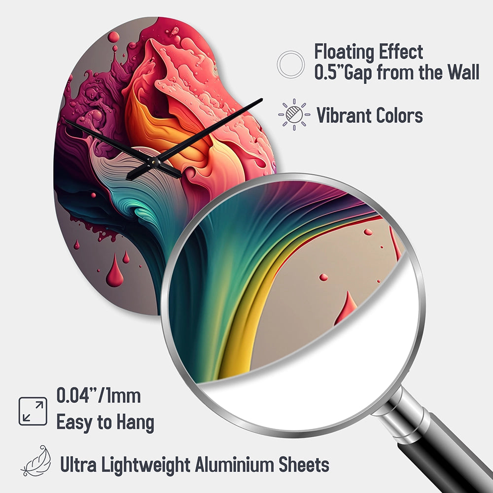 Elevate your space with this Modern asymmetrical metal wall Clock. Our handcrafted metal wall sculptures combine modern design with artistic elegance, creating a striking focal point in any room. This asymmetric metal wall Clock features unique, irregular shapes that bring dynamic movement and depth to your walls. Perfect for Abstract decor, these Multicolor irregular metal wall sculptures are printed on aluminum panel, with extra gloss ensuring long-lasting beauty. Ideal for living rooms, offices decor, or entrance, this statement piece adds a bold, Abstract touch to any decor.