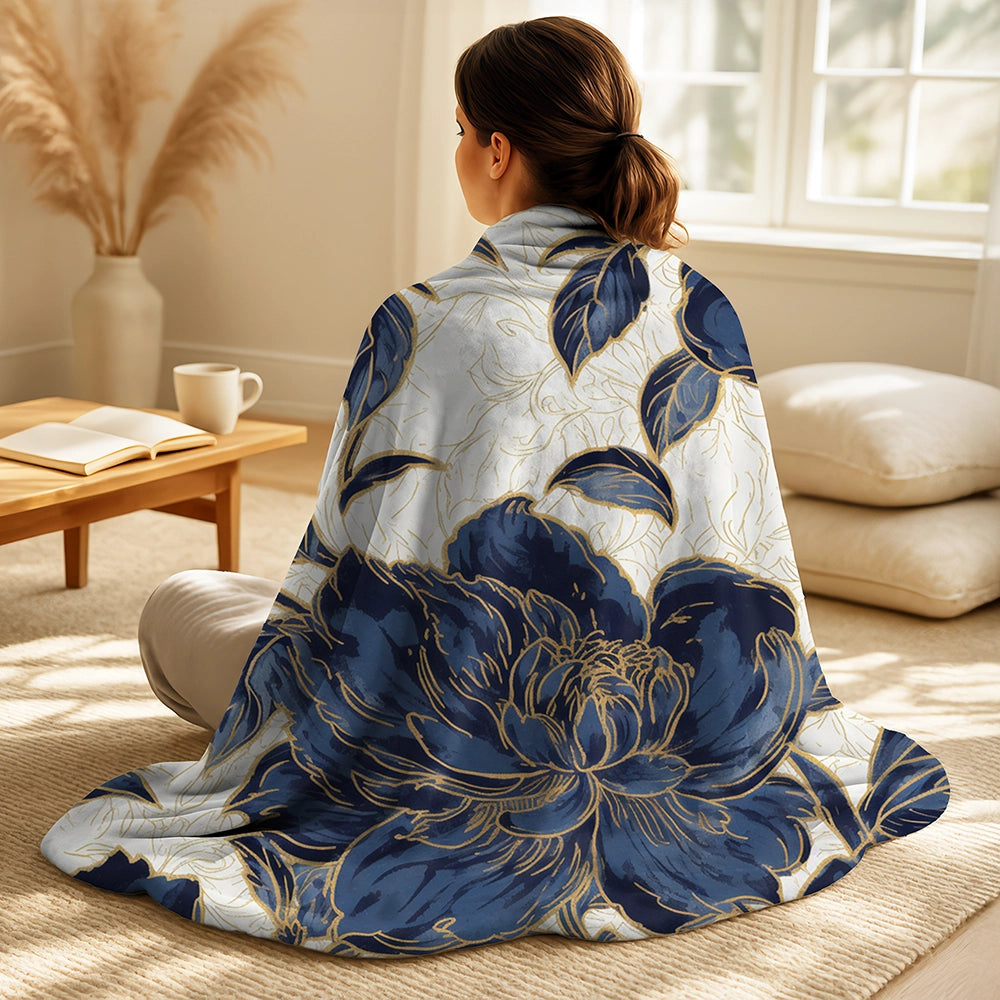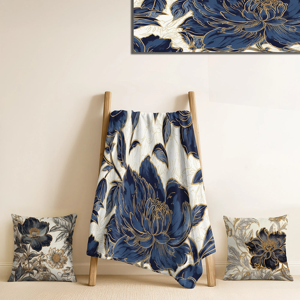 Peonies Throw Blanket - Blue Gold Peonies Symphony IV