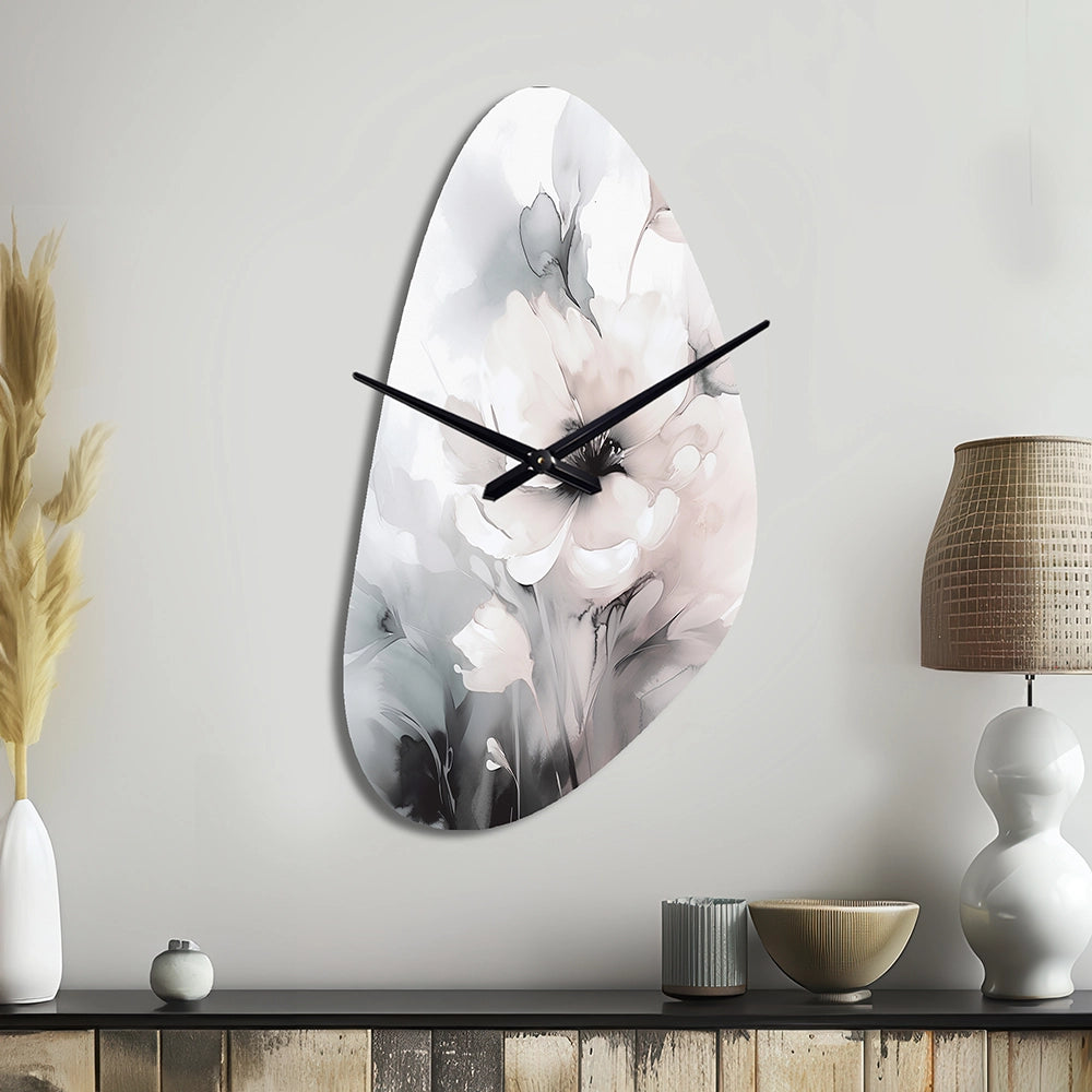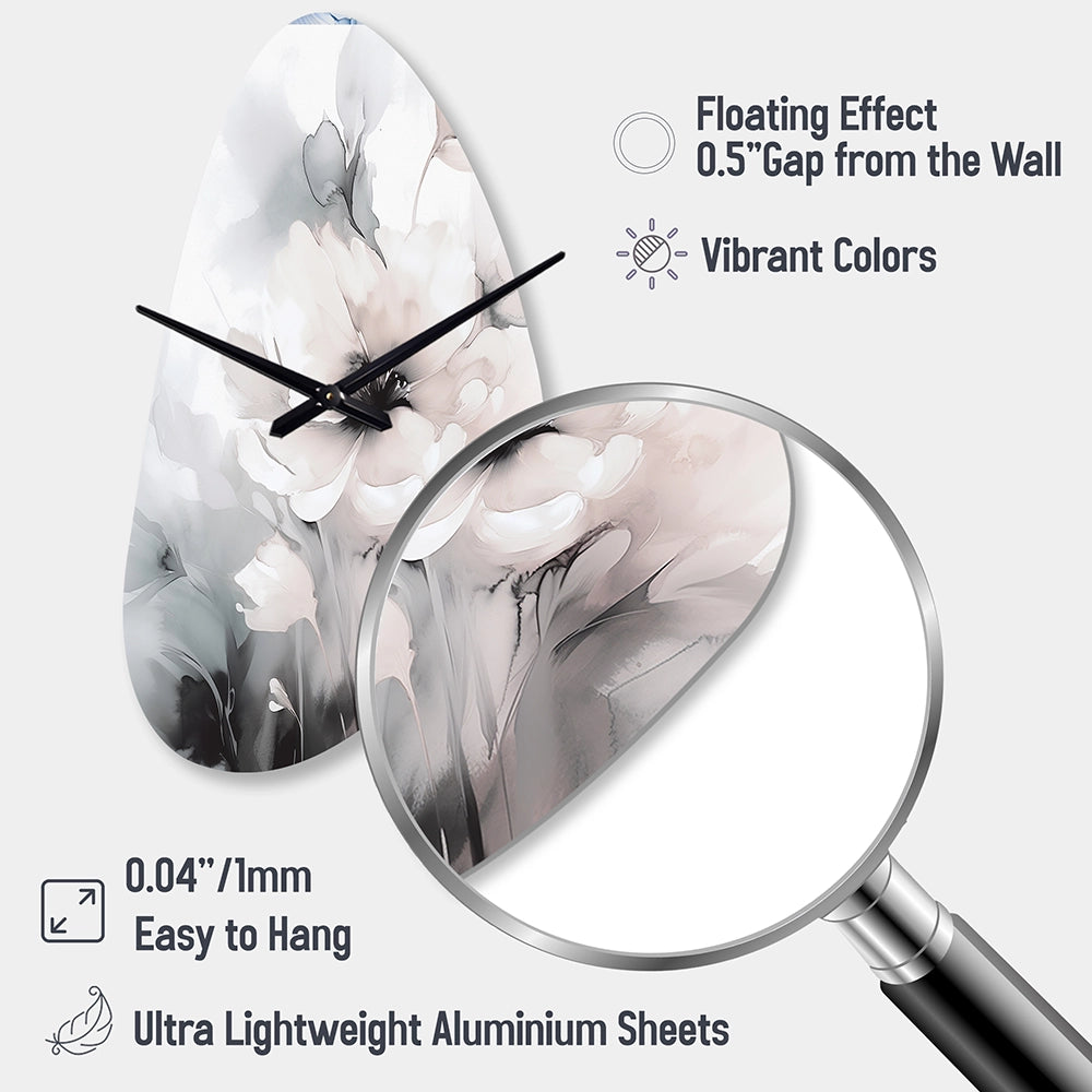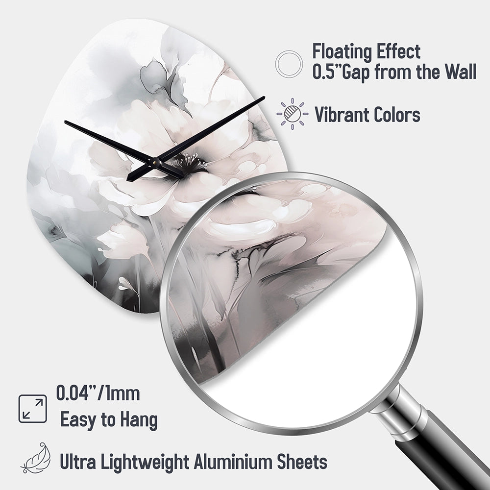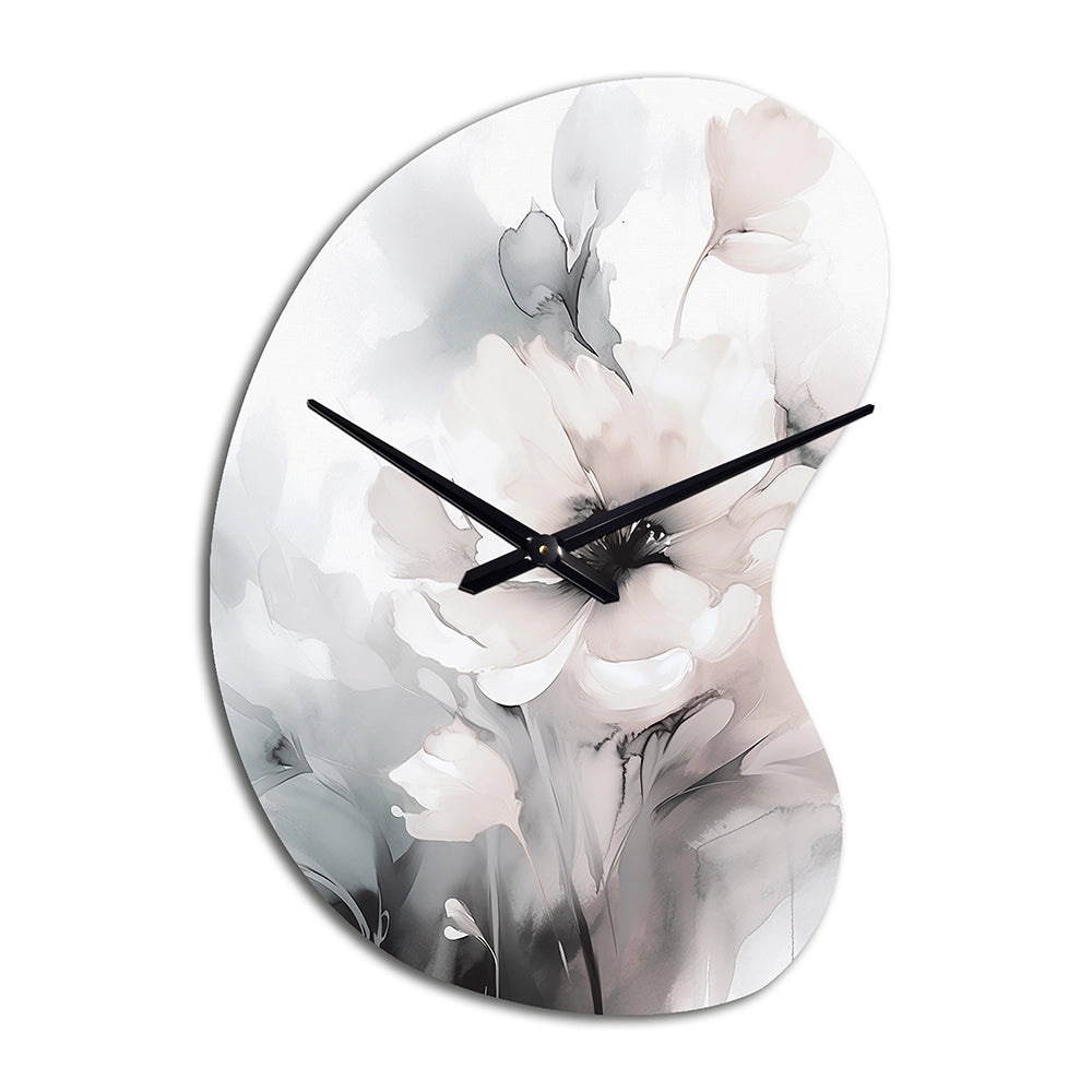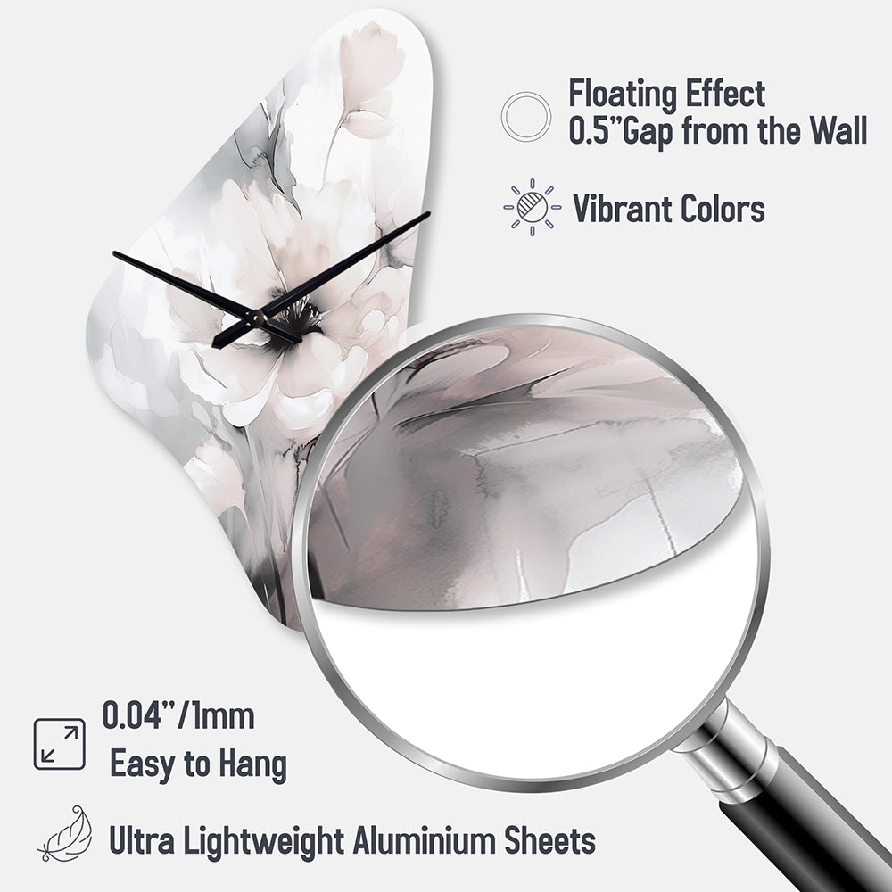 Soft Light Grey Flowers I - Asymmetric Metal Wall Clock
