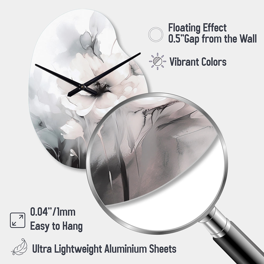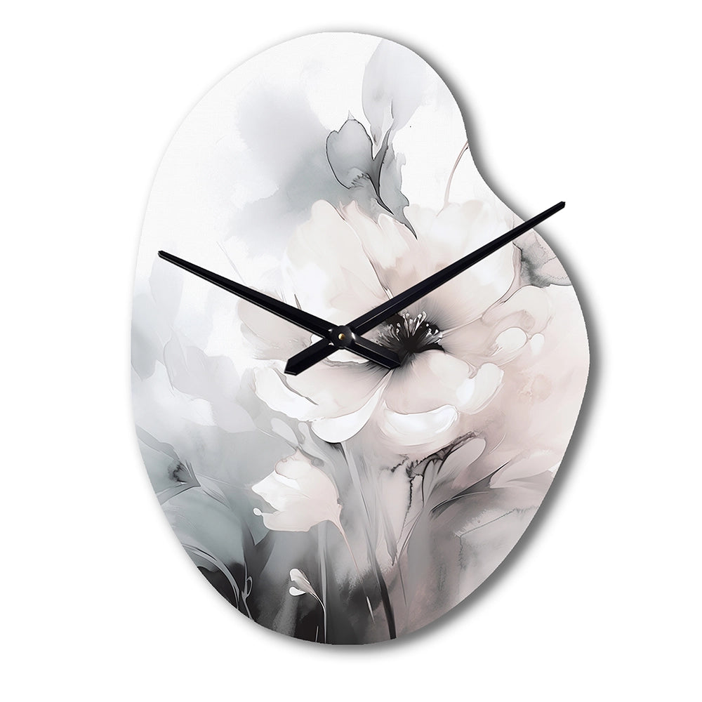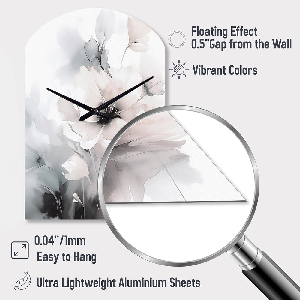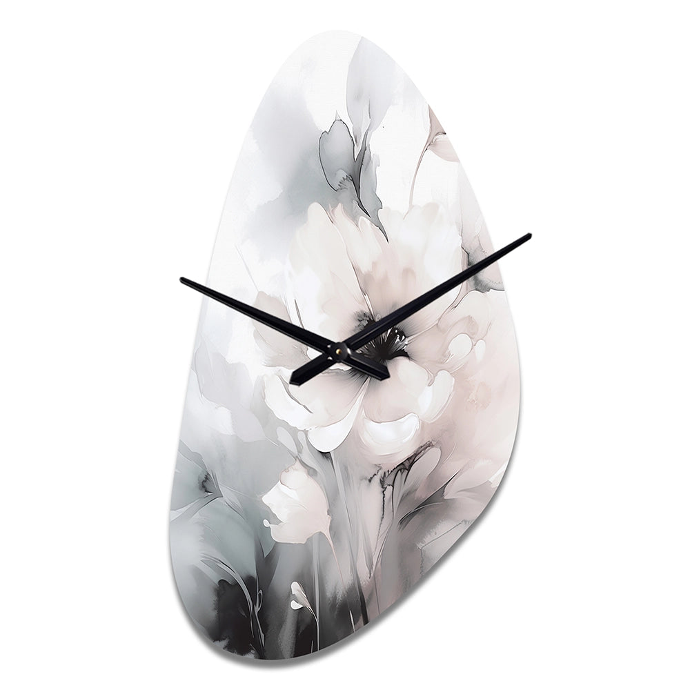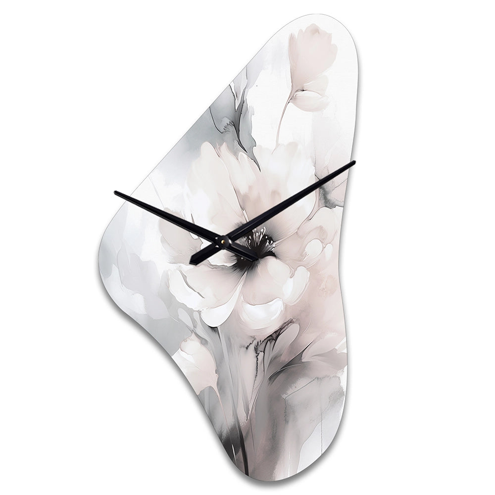 Soft Light Grey Flowers I - Asymmetric Metal Wall Clock