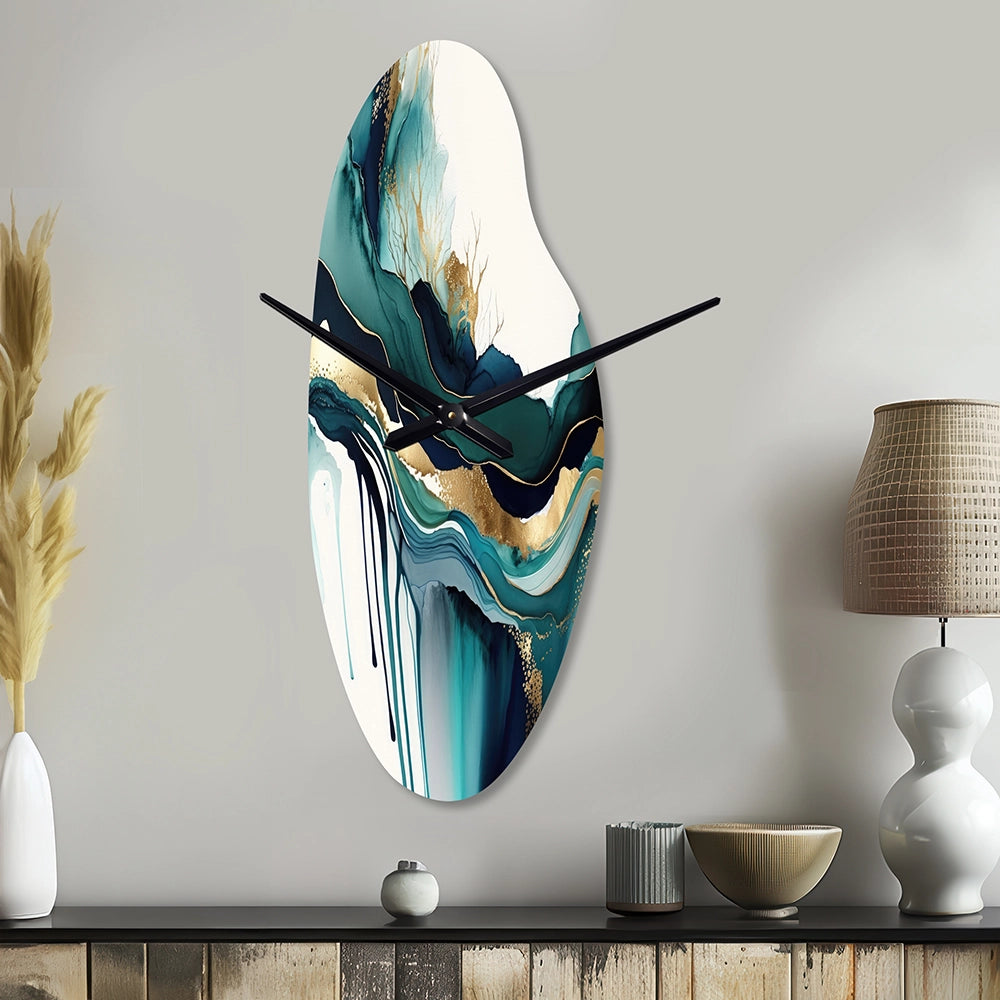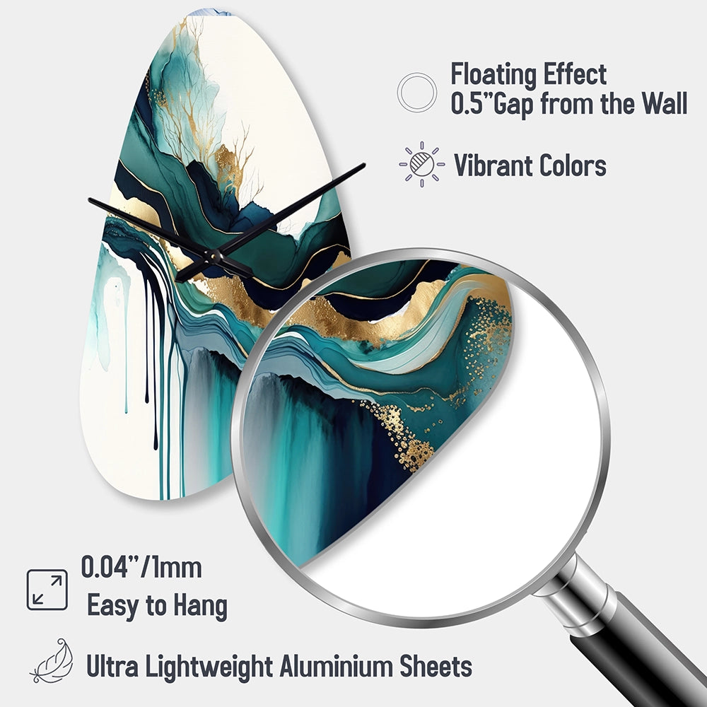Elevate your space with this Modern asymmetrical metal wall Clock. Our handcrafted metal wall sculptures combine modern design with artistic elegance, creating a striking focal point in any room. This asymmetric metal wall Clock features unique, irregular shapes that bring dynamic movement and depth to your walls. Perfect for Abstract decor, these Turquoise irregular metal wall sculptures are printed on aluminum panel, with extra gloss ensuring long-lasting beauty. Ideal for living rooms, offices decor, or entrance, this statement piece adds a bold, Abstract touch to any decor.