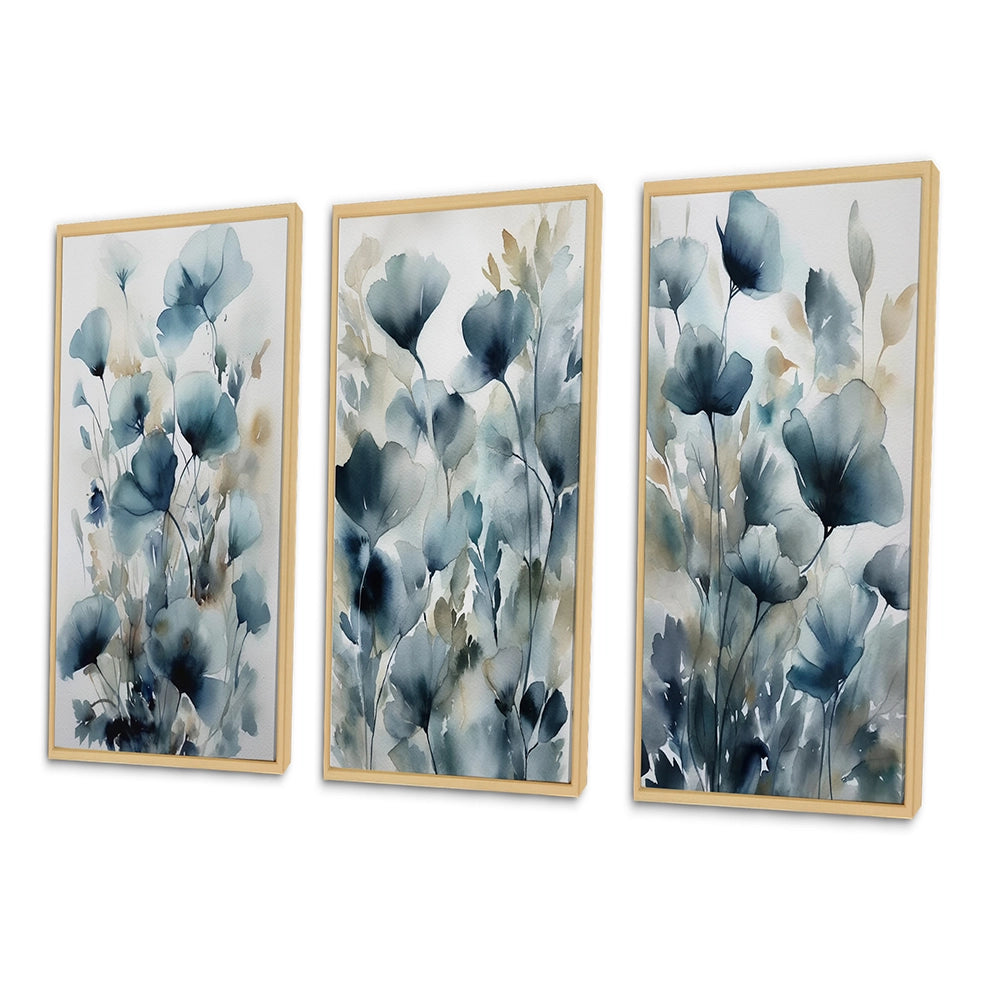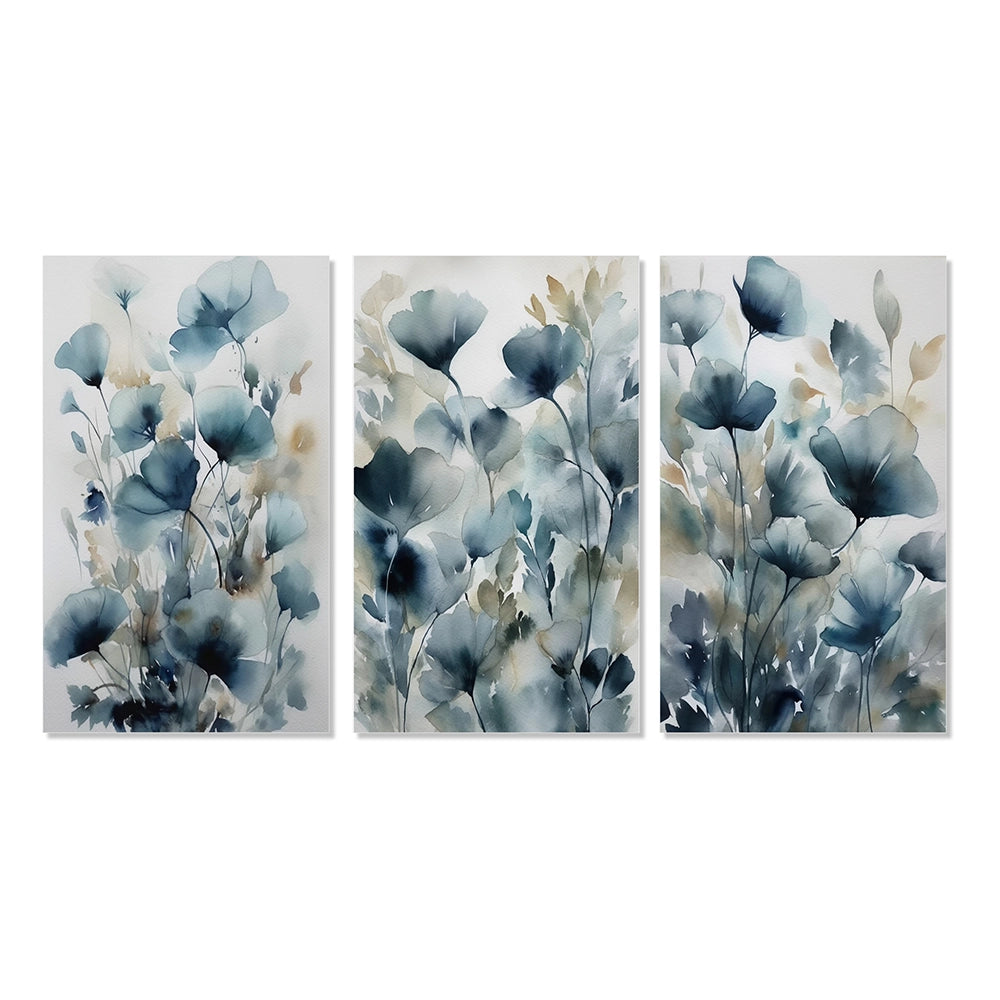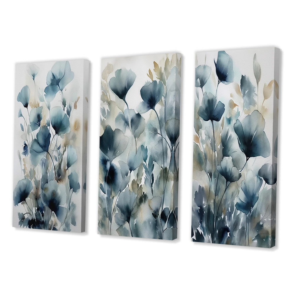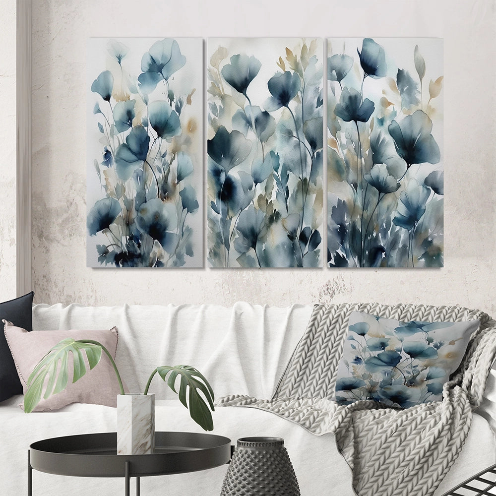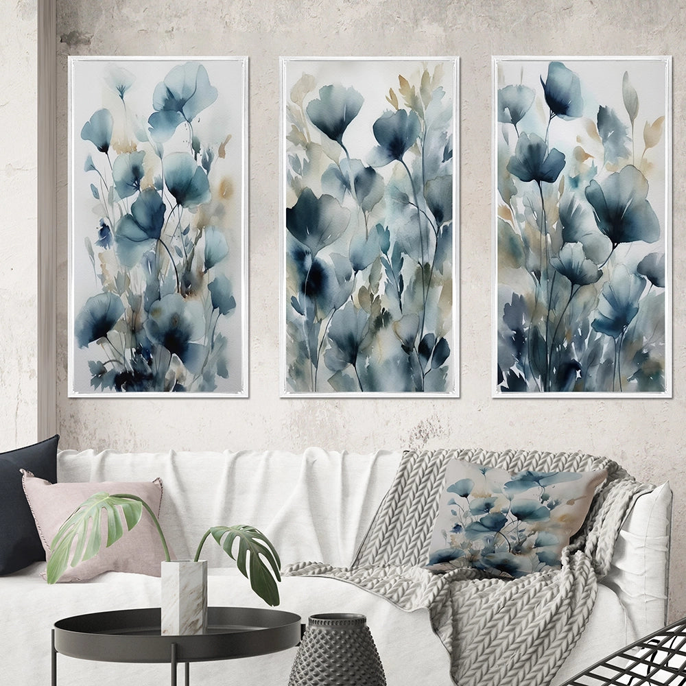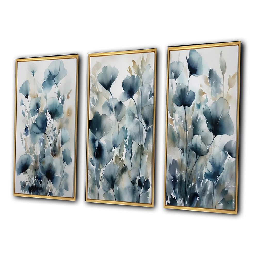 Traditional Wall Art Canvas Set - Blue Leaf Foliage And Flowers III - 3 Pieces
